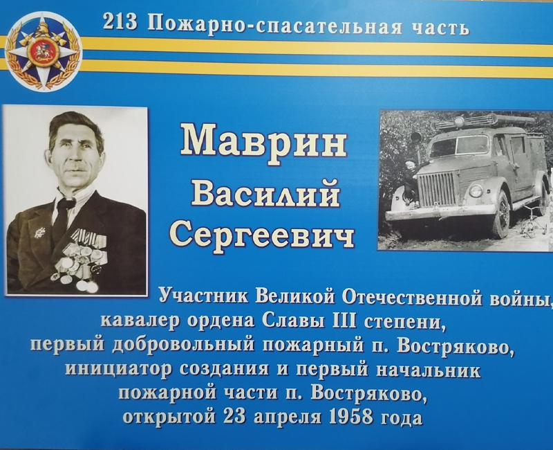– Василий Сергеевич – первый добровольный пожарный посёлка Востряково, – рассказал корреспонденту газеты «Призыв» начальник пожарно-спасательной части № 213 Сергей Стёпин. – В 50-е годы прошлого века он на свои средства приобрёл старый, списанный пожарный автомобиль, отремонтировал его и на нём выезжал на тушение пожаров в посёлке.
